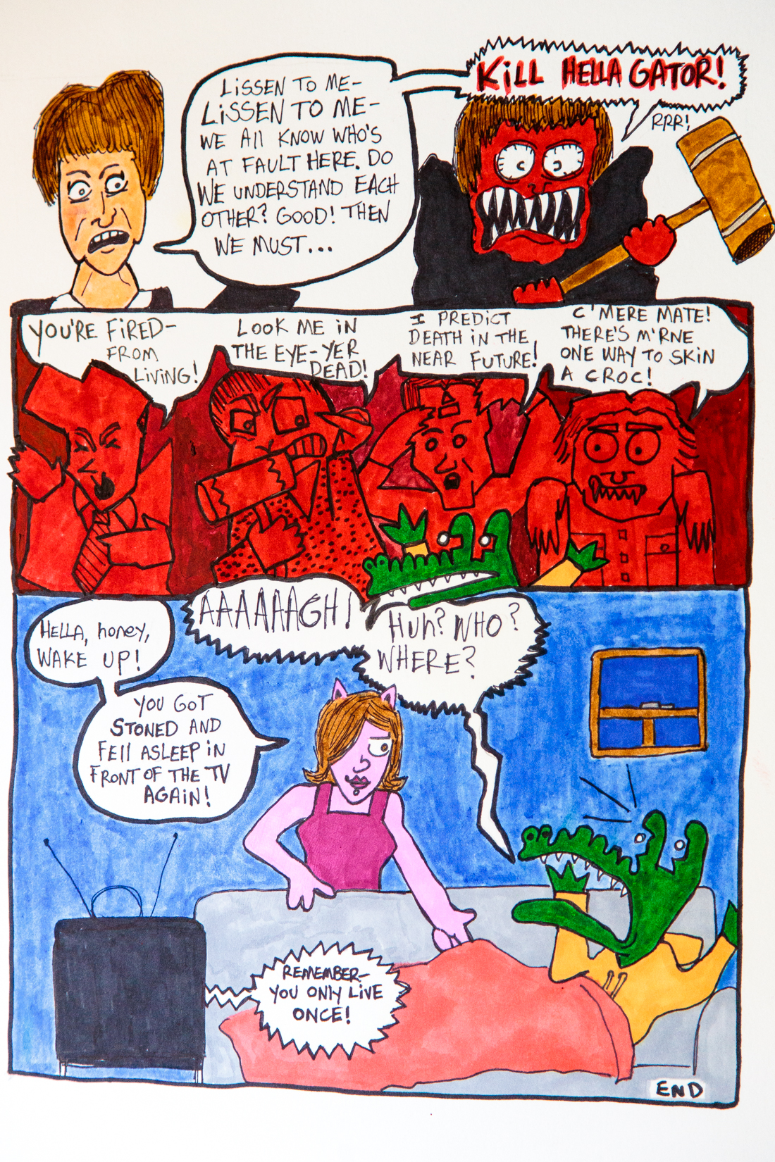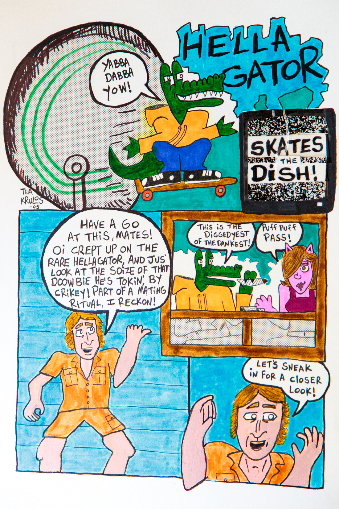 Anyway, what follows is a comic I discovered while digging through a box of archives recently. I drew it in 2005, ten years ago. I submitted it to High Times magazine and got no reply, so stashed it in an archive. It has never been published anywhere. It is really stupid goofy, but it is my birthday, so I’m publishing it. It stars a stoner alligator character I invented, Hella Gator, and his girlfriend, Cat. In this comic he has a dream he where he encounters parodies of Steve Irwin, the Crocodile Hunter, psychic John Edward of Crossing Over w/ Aforementioned, Judge Judy, and a cameo by Potential Future President Donald Trump. Some things have changed since then– who has a satellite dish anymore? Steve Irwin is dead, John Edward has a different show, but Donald Trump’s hair still looks like a loaf of bread. I no longer find inspiration from smoking weed and watching basic cable (apparently the basis of this comic), but here is something that survives from that era.