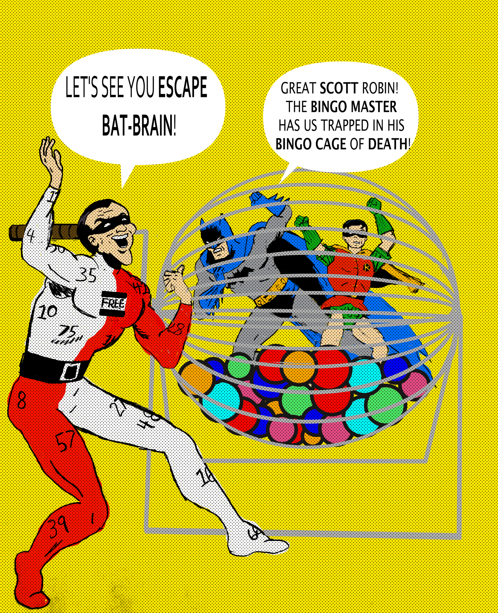 My friend David Gloyd II mocked up some art of the Bingo Master in action (he based it on the cover of Detective Comics #140 (1948), the Riddler’s first appearance).