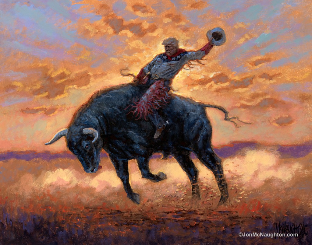 Here’s what I mean, visualized. This is Trump supporter Jon McNaughton’s latest masterpiece, “2020 Ride.” I wrote about McNaughton’s art in a column from February titled “Laughing My Ass Off at These Bonkers Trump Paintings.” Here McNaughton says he is showing Trump as a cowboy hero, successfully taming all of the issues of 2020.