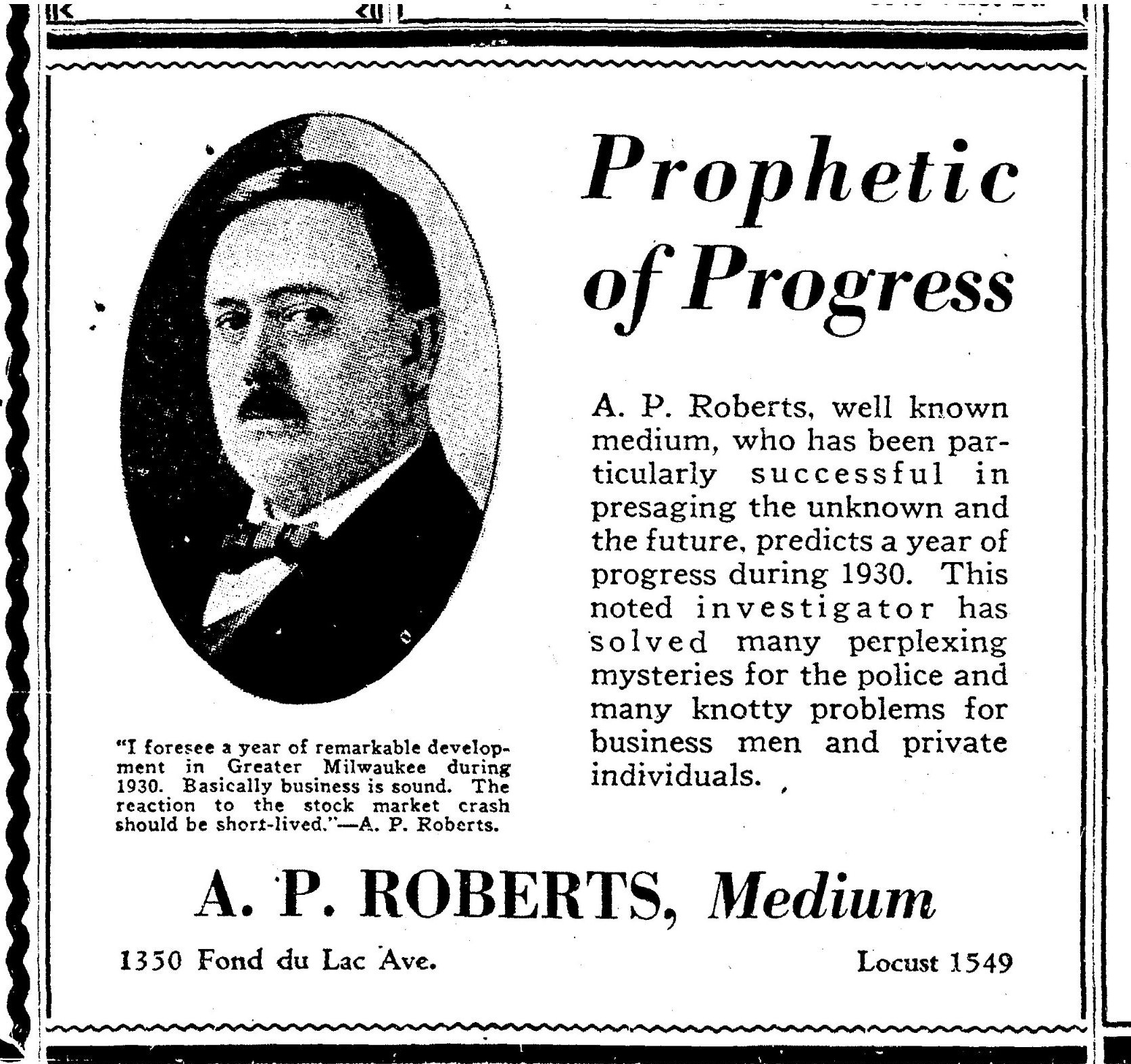 -Roberts was born in Wales, and moved to Fox Lake, WI as a teen to live with an uncle. He moved briefly to North Dakota, where he worked on a ranch. It’s unknown exactly when he moved to Milwaukee, but he opened his psychic detective business out of his house here in 1895.