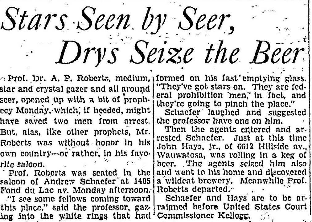 I’m a bit leery of TV shows. Some of them will ask you to do stuff like roll around on the ground and pretend you’re being attacked by a ghost and all sorts of rubbish. But in this case they just wanted me to talk about what I knew about Roberts and other famous psychic case files. In the case of Roberts, I didn’t want to just parrot Anna’s article, so I took a bit of a dive into newspaper archives (mostly the Milwaukee Journal and Sentinel) and I found some pretty great stuff. I’ll be talking about it more on the show, of course, and I’m also writing an article that goes into more detail (I’m not sure when or where that article will appear yet). Meanwhile, here are some things I discovered about Arthur Price Roberts to give you a little bit of background.