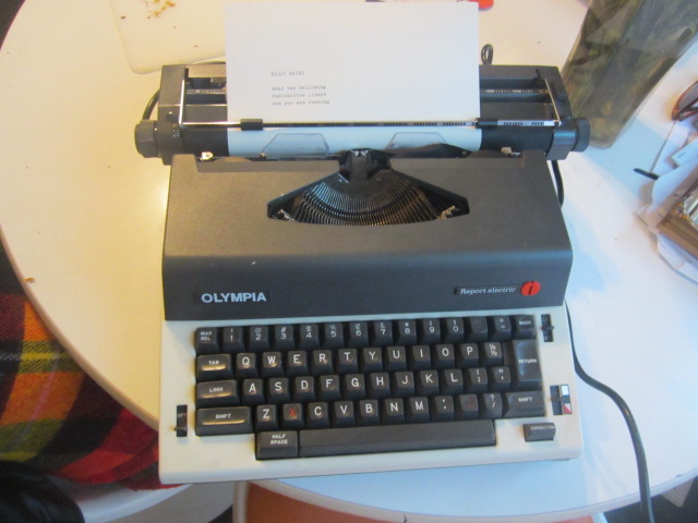 You can imagine my surprise and delight at the inner workings of the universe when I was walking around Riverwest (my neighborhood) about two days after being back. I happened to perchance upon a black plastic case sitting by the curb with a note taped to it– “FREE! Not sure if it works.” I opened it up and it was a solid looking Olympia typewriter.