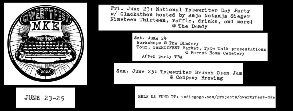 Hey all, last year me and Molly Snyder launched a new entry in the “City of Festivals” (Milwaukee) called QWERTYFEST MKE, which celebrates writing, innovation, history, creativity… and, of course, typewriters. This year we have ambitious plans for a bigger event. We’re doing an opening night party at Turner Hall (with the Boston Typewriter Orchestra), and presentations and activities throughout the weekend. To help finance this, we’ve set up an Indiegogo fundraiser. Lots of great perks, including QF tickets, t-shirts, and subscriptions to our in-house zine, QWERTY Quarterly. As of right now, we’re at about 30% funded– I’d love to see that bump up to 50% funded by the end of this weekend. The link to that: https://www.indiegogo.com/projects/qwertyfest-mke-2024/